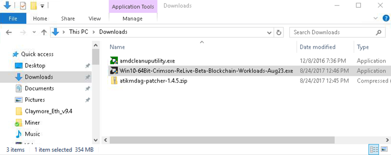 Приступаем к рассмотрению установки графических драйверов. Когда пользователь перезагрузил ПК, следует открыть папку «Загрузки». Два раза кликаем на установочный файл драйвера AMD. Называем его: «Win10-64Bit-Crimson-ReLive-Beta-Blockchain-Workloads-Aug23.exe».